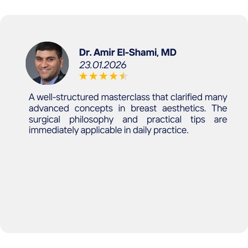 The Total Definer Breast Aesthetics Masterclass – First Edition delivers a focused and practical approach to modern breast aesthetic surgery. By combining strong foundational principles with advanced surgical strategies, this course empowers surgeons to make confident decisions, refine their techniques, and achieve predictable, high-quality results.